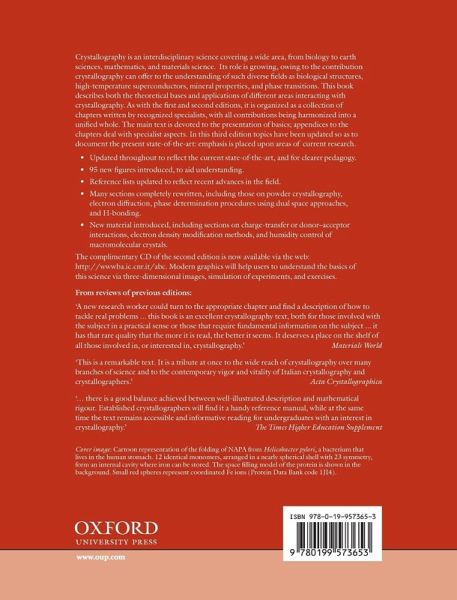 Crystallography is an interdisciplinary science covering a wide area, from biology to earth sciences, mathematics and materials science. Its role is growing, owing to the contribution crystallography can offer to the understanding of such diverse fields as biological structures, high-temperature superconductors, mineral properties, and phase transitions. The book describes both the theoretical bases and applications of different areas interacting withcrystallography. As with the first and second editions, it is organized as a collection of chapters written by recognized specialists, with all contributions being harmonized into a unified whole. The main text is devoted to the presentation of basics; the appendices deal with specialist aspects. In this thirdedition topics have been updated so as to document the present state of the art: emphasis is placed upon areas of current research. To facilitate learning and make teaching more effective, new illustrations have been introduced. As with the second edition, a software package is included via the book's OUP web site: modern graphics will help users to better understand the basics of this science via three-dimensional images, simulation of experiments, and exercises.