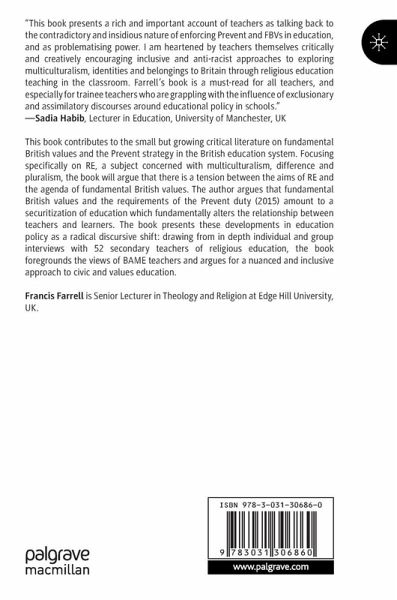 This book contributes to the small but growing critical literature on fundamental British values and the Prevent strategy in the British education system. Focusing specifically on RE, a subject concerned with multiculturalism, difference and pluralism, the book will argue that there is a tension between the aims of RE and the agenda of fundamental British values. The author argues that fundamental British values and the requirements of the Prevent duty (2015) amount to a securitization of education which fundamentally alters the relationship between teachers and learners. The book presents these developments in education policy as a radical discursive shift: drawing from in depth individual and group interviews with 52 secondary teachers of religious education, the book foregrounds the views of BAME teachers and argues for a nuanced and inclusive approach to civic and values education.