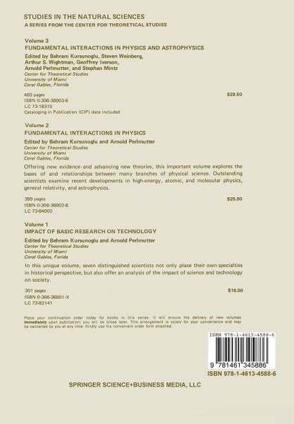 The present volume is a compilation of the talks presented at the 1972 Coral Gables Conference on Fundamental Interactions at High Energy held at the University of Miami by the Center for Theoretical Studies. The volume contains, in addition, contributions by B. Kursunoglu and G. Breit, which were not actually presented, but are included as tributes to Professor P.A.M. Dirac, to whom the Conference is formally dedicated. Again this year the theme, style and format of each session was in most cases the responsibility of the section leaders who also cons~ituted the Conference Committee. This organization of the conference meant that each section was coherent and essentially self-contained, and as weIl, allowed for spirited panel discussions to critically summarize, and to indicate new directions for future research. This volume is divided into four sections on Constructive Field Theory, and Advances in the Theory of Weak and Electro magnetic Interactions, Cosmic Evolution,and New Vistas in the Theory of Fundamental Interactions. Each section represents a thorough, penetrating survey of one of the most active research programs of theoretical physics. Thanks are due to typists Mrs. Helga S. Billings, Mrs. Jackie Zagursky, Miss Connie Retting, and to Mrs. Norma Gayle Hagan for her industrious supervision of the many programs involved in the conference. This conference received some support from the Atomic Energy Commission and the National Aeronautics and Space Administration. The Editors vii Miss Sevil Kursunoglu, Professor Behram Kursunoglu, Professor P. A. M. Dirac, Mrs. Behram Kursunoglu, Mr.