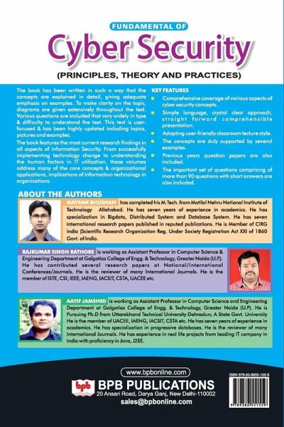 Description- The book has been written in such a way that the concepts are explained in detail, givingadequate emphasis on examples. To make clarity on the topic, diagrams are given extensively throughout the text. Various questions are included that vary widely in type and difficulty to understand the text. This text is user-focused and has been highly updated including topics, pictures and examples. The book features the most current research findings in all aspects of information Security. From successfully implementing technology change to understanding the human factors in IT utilization, these volumes address many of the core concepts and organizational applications, implications of information technology in organizations. Key Features · Comprehensive coverage of various aspects of cyber security concepts. · Simple language, crystal clear approach, straight forward comprehensible presentation. · Adopting user-friendly classroom lecture style. · The concepts are duly supported by several examples. · Previous years question papers are also included. · The important set of questions comprising of more than 90 questions with short answers are also included. Table of Contents: Chapter-1 : Introduction to Information Systems Chapter-2 : Information Security Chapter-3 : Application Security Chapter-4 : Security Threats Chapter-5 : Development of secure Information System Chapter-6 : Security Issues In Hardware Chapter-7 : Security Policies Chapter-8 : Information Security Standards