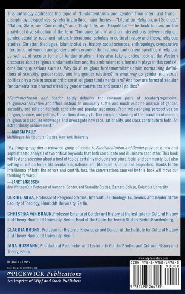 Description: This anthology addresses the topic of ""fundamentalism and gender"" from inter- and trans-disciplinary perspectives. By referring to three major themes--""Literalism, Religion, and Science,"" ""Nation, State, and Community,"" and ""Body, Life, and Biopolitics""--the book focuses on the analytical diversification of the term ""fundamentalism"" and on intersections between religion, gender, sexuality, race, and nation. International scholars in cultural history and theory, religious studies, Christian theologies, Islamic studies, history, social sciences, anthropology, comparative literature, and women and gender studies examine the historical and current specifics of religious as well as of secular forms of fundamentalism. They also take a critical look at the Western discourse about religious fundamentalism and the ambivalent role feminism plays in this context, considering questions such as, Why do all religious fundamentalisms claim normalizing definitions of sexuality, gender roles, and intergender relations? In what way do gender and sexual politics play a role in secular criticism of religious fundamentalism? And how are forms of secular fundamentalism characterized by gender constructs and sexual politics?