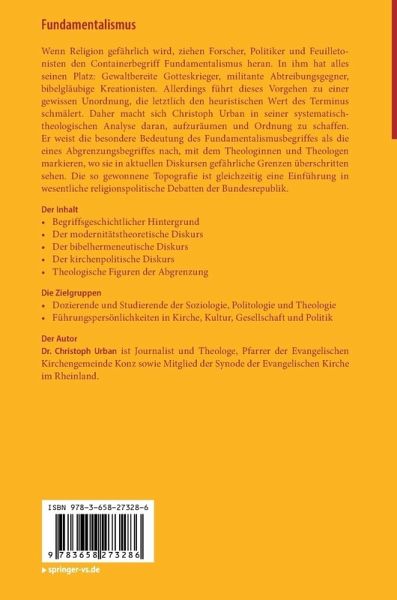 Wenn Religion gefährlich wird, ziehen Forscher, Politiker und Feuilletonisten den Containerbegriff Fundamentalismus heran. In ihm hat alles seinen Platz: Gewaltbereite Gotteskrieger, militante Abtreibungsgegner, bibelgläubige Kreationisten. Allerdings führt dieses Vorgehen zu einer gewissen Unordnung, die letztlich den heuristischen Wert des Terminus schmälert. Daher macht sich Christoph Urban in seiner systematisch-theologischen Analyse daran, aufzuräumen und Ordnung zu schaffen. Er weist die besondere Bedeutung des Fundamentalismusbegriffes als die eines Abgrenzungsbegriffes nach, mit dem Theologinnen und Theologen markieren, wo sie in aktuellen Diskursen gefährliche Grenzen überschritten sehen. Die so gewonnene Topografie ist gleichzeitig eine Einführung in wesentliche religionspolitische Debatten der Bundesrepublik.