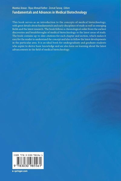 The advent of Medical Biotechnology.- Biotechnology in Medicine: Fundamentals.- Biotechnology in Medicine: Advances-I.- Biotechnology in Medicine: Advances-II.- Analytical Techniques in Medical Biotechnology.- Immunology in Medical Biotechnology.- Epigenetics and Medical Biotechnology.- Stem Cell Technology in Medical Biotechnology.- Pharmaceutical Biotechnology.- Diagnostic and Therapeutic Biotechnology.- Nanotechnology and Nanomedicine.- Laboratory Protocols in Medical Biotechnology-I.- Laboratory Protocols in Medical Biotechnology-II.- Ethics and Medical Biotechnology.- Career and opportunities in Medical Biotechnology.- Index.