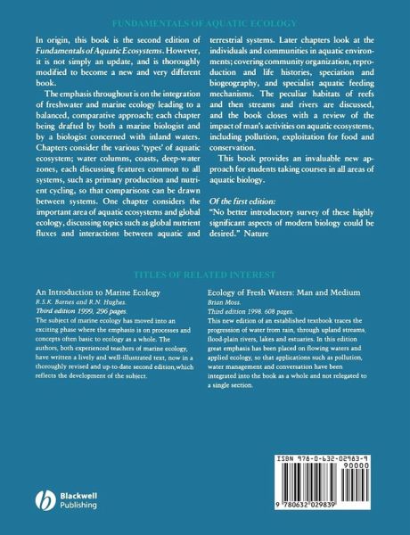 In origin, this book is the second edition of Fundamentals of Aquatic Ecosystems. However, it is not simply an update, and is thoroughly modified to become a new and very different book. The emphasis throughout is on the integration of freshwater and marine ecology leading to a balanced, comparative approach; each chapter being drafted by both a marine biologist and by a biologist concerned with inland waters. Chapters consider the various 'types' of aquatic ecosystem; water columns, coasts, deep-water zones, each discussing features common to all systems, such as primary production and nutrient cycling, so that comparisons can be drawn between systems. One chapter considers the important area of aquatic ecosystems and global ecology, discussing topics such as global nutrient fluxes and interactions between aquatic and terrestrial systems. Later chapters look at the individuals and communities in aquatic environments; covering community organization, reproduction and life histories, speciation and biogeography, and specialist aquatic feeding mechanisms. The peculiar habitats of reefs and then streams and rivers are discussed, and the book closes with a review of the impact of man's activities on aquatic ecosystems, including pollution, exploitation for food and conservation. This book provides an invaluable new approach for students taking courses in all areas of aquatic biology. Of the first edition: "No better introductory survey of these highly significant aspects of modern biology could be desired." Nature