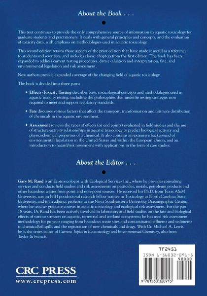 This text is divided into three parts. The first part describes basic toxicological concepts and methodologies used in aquatic toxicity testing, including the philosophies underlying testing strategies now required to meet and support regulatory standards. The second part of the book discusses various factors that affect transport, transformation, ultimate distribution, and accumulation of chemicals in the aquatic environment, along with the use of modelling to predict fate.; The final section of the book reviews types of effects or endpoints evaluated in field studies and the use of structure-activity relationships in aquatic toxicology to predict biological activity and physio-chemical properties of a chemical. This section also contains an extensive background of environmental legislation in the USA and within the European Community, and an introduction to hazard/risk assessment with case studies.