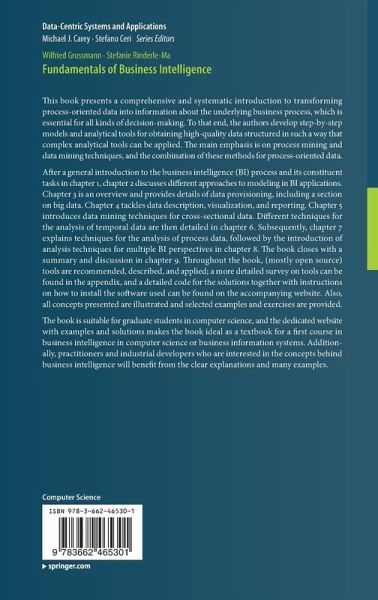 After a general introduction to the business intelligence (BI) process and its constituent tasks in chapter 1, chapter 2 discusses different approaches to modeling in BI applications. Chapter 3 is an overview and provides details of data provisioning, including a section on big data. Chapter 4 tackles data description, visualization, and reporting. Chapter 5 introduces data mining techniques for cross-sectional data. Different techniques for the analysis of temporal data are then detailed in Chapter 6. Subsequently, chapter 7 explains techniques for the analysis of process data, followed by the introduction of analysis techniques for multiple BI perspectives in chapter 8. The book closes with a summary and discussion in chapter 9. Throughout the book, (mostly open source) tools are recommended, described and applied; a more detailed survey on tools can be found in the appendix, and a detailed code for the solutions together with instructions on how to install the software used can be found on the accompanying website. Also, all concepts presented are illustrated and selected examples and exercises are provided.