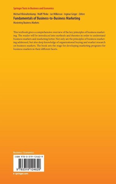 This textbook gives a comprehensive overview of the key principles of business marketing. The reader will be introduced into methods and theories in order to understand business markets and marketing better. Not only are the principles of business marketing addressed, but also deep knowledge of organizational buying and market research on business markets. The book sets the stage for developing marketing programs for business markets in their different facets.