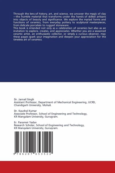 Through the lens of history, art, and science, we uncover the magic of clay-the humble material that transforms under the hands of skilled artisans into objects of beauty and significance. We explore the myriad forms and functions of ceramics, from everyday pottery to sculptural masterpieces, from delicate porcelain to rugged stoneware.This book is intended not only as a celebration of ceramics but also as an invitation to explore, creates, and appreciates. Whether you are a seasoned ceramic artist, an enthusiastic collector, or simply a curious observer, may these pages spark your imagination and deepen your appreciation for the timeless art of ceramics.