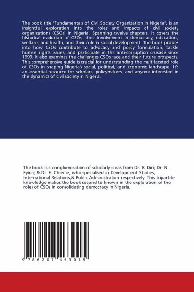 The book title "Fundamentals of Civil Society Organization in Nigeria", is an insightful exploration into the roles and impacts of civil society organizations (CSOs) in Nigeria. Spanning twelve chapters, it covers the historical evolution of CSOs, their involvement in democracy, education, welfare, and health, and their role in social development. The book probes into how CSOs contribute to advocacy and policy formulation, tackle human rights issues, and participate in the anti-corruption crusade since 1999. It also examines the challenges CSOs face and their future prospects. This comprehensive guide is crucial for understanding the multifaceted role of CSOs in shaping Nigeria's social, political, and economic landscape. It's an essential resource for scholars, policymakers, and anyone interested in the dynamics of civil society in Nigeria.