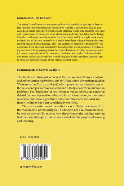 "...This book is an abridged version of the book "Convex Analysis and Minimization Algorithms" (shortly CAMA) written in two volumes by the same authors... . The authors have extracted from CAMA Chapters III-VI and X, containing the fundamentals of convex analysis, deleting material seemed too advanced for an introduction, or too closely attached to numerical algorithms. Each Chapter is presented as a "lesson" treating a given subject in its entirety, completed by numerous examples and figures. So, this new version becomes a good book for learning and teaching of convex analysis in finite dimensions...." S. Mititelu in "Zentralblatt für Mathematik und ihre Grenzgebiete", 2002