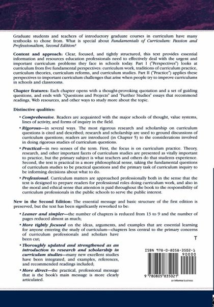 Graduate students and teachers of introductory graduate courses in curriculum have many textbooks to choose from. What is special about Fundamentals of Curriculum: Passion and Professionalism, Second Edition? Content and approach: Clear, focused, and tightly structured, this text provides essential information and resources education professionals need to effectively deal with the urgent and important curriculum problems they face in schools today. Part I ("Perspectives") looks at curriculum from five fundamental perspectives: curriculum work, traditions of curriculum practice, curriculum theories, curriculum reforms, and curriculum studies. Part II ("Practice") applies these perspectives to important curriculum challenges that arise when people try to improve curriculums in schools and classrooms. Chapter features: Each chapter opens with a thought-provoking quotation and a set of guiding questions, and ends with "Questions and Projects" and "Further Studies" essays that recommend readings, Web resources, and other ways to study more about the topic. Distinctive qualities: Comprehensive. Readers are acquainted with the major schools of thought, value systems, lines of activity, and forms of inquiry in the field. Rigorous. The most rigorous research and scholarship on curriculum questions is cited and described; research and scholarship are used to ground discussions of curriculum questions; readers are introduced to the considerations involved in doing rigorous studies of curriculum questions. Practical. First, the focus is on curriculum practice. Theory, research, and other important facets of curriculum studies are presented as vitally important to practice, but the primary subject is what teachers and others do that students experience. Second, the text is practical in a more philosophical sense, taking the fundamental questions of curriculum studies to be practical questions and the primary task of curriculum inquiry to be informing decisions about what to do. Professional. Curriculum matters are approached professionally both in the sense that the text is designed to prepare readers for professional roles doing curriculum work, and also in the moral and ethical sense that attention is paid throughout the book to the responsibility of curriculum professionals in the public schools to serve the public interest. New in the Second Edition: The essential message and basic structure of the first edition is preserved, but the text has been significantly reworked to be: *leaner and simpler--the number of chapters is reduced from 13 to nine and the number of pages reduced almost as much; *more tightly focused on the ideas, arguments, and examples that are essential learning for anyone entering the study of curriculum--chapters less central to the primary concerns of curriculum professionals and scholars have been cut; *throughly updated and strengthened as an introduction to research and scholarship in curriculum studies--many new excellent studies have been integrated, and examples, references, and recommended readings included; and *more direct--the practical, professional message that is the book's main message is more clearly articulated.