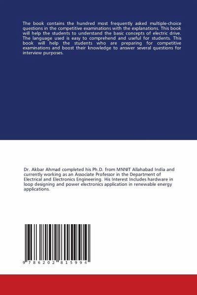 The book contains the hundred most frequently asked multiple-choice questions in the competitive examinations with the explanations. This book will help the students to understand the basic concepts of electric drive. The language used is easy to comprehend and useful for students. This book will help the students who are preparing for competitive examinations and boost their knowledge to answer several questions for interview purposes.