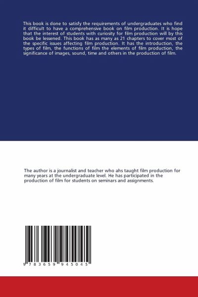 This book is done to satisfy the requirements of undergraduates who find it difficult to have a comprehensive book on film production. It is hope that the interest of students with curiosity for film production will by this book be lessened. This book has as many as 21 chapters to cover most of the specific issues affecting film production. It has the introduction, the types of film, the functions of film the elements of film production, the significance of images, sound, time and others in the production of film.