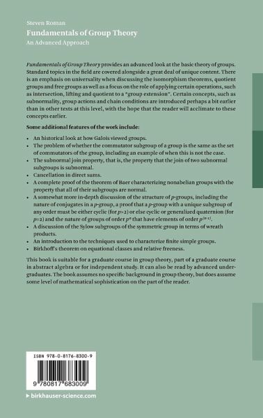 Fundamentals of Group Theory provides a comprehensive account of the basic theory of groups. Both classic and unique topics in the field are covered, such as an historical look at how Galois viewed groups, a discussion of commutator and Sylow subgroups, and a presentation of Birkhoff s theorem. Written in a clear and accessible style, the work presents a solid introduction for students wishing to learn more about this widely applicable subject area.