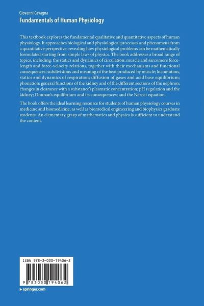 This textbook explores the fundamental qualitative and quantitative aspects of human physiology. It approaches biological and physiological processes and phenomena from a quantitative perspective, revealing how physiological problems can be mathematically formulated starting from simple laws of physics. The book addresses a broad range of topics, including: the statics and dynamics of circulation; muscle and sarcomere force-length and force-velocity relations, together with their mechanisms and functional consequences; subdivisions and meaning of the heat produced by muscle; locomotion, statics and dynamics of respiration; diffusion of gases and acid base equilibrium; phonation; general functions of the kidney and of the different sections of the nephron; changes in clearance with a substance's plasmatic concentration; pH regulation and the kidney; Donnan's equilibrium and its consequences; and the Nernst equation.