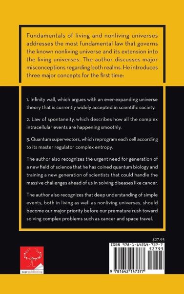 Fundamentals of living and nonliving universes addresses the most fundamental law that governs the known nonliving universe and its extension into the living universes. The author discusses major misconceptions regarding both realms. He introduces three major concepts for the first time: 1. Infinity wall, which argues with an ever-expanding universe theory that is currently widely accepted in scientific society. 2. Law of spontaneity, which describes how all the complex intracellular events are happening smoothly. 3. Quantum supervectors, which reprogram each cell according to its master regulator complex entropy. The author also recognizes the urgent need for generation of a new field of science that he has coined quantum biology and training a new generation of scientists that could handle the massive challenges ahead of us in solving diseases like cancer. The author also recognizes that deep understanding of simple events, both in living as well as nonliving universes, should become our major priority before our premature rush toward solving complex problems such as cancer and space travel.