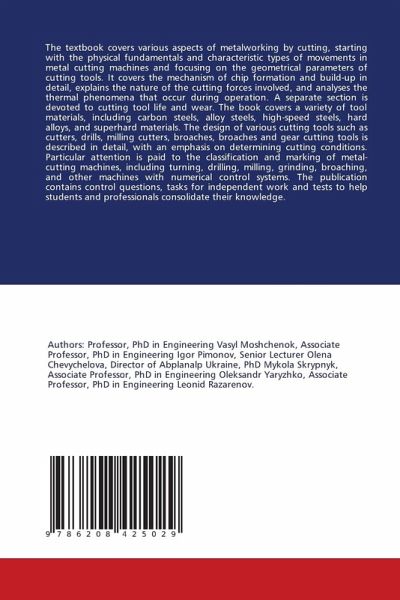 The textbook covers various aspects of metalworking by cutting, starting with the physical fundamentals and characteristic types of movements in metal cutting machines and focusing on the geometrical parameters of cutting tools. It covers the mechanism of chip formation and build-up in detail, explains the nature of the cutting forces involved, and analyses the thermal phenomena that occur during operation. A separate section is devoted to cutting tool life and wear. The book covers a variety of tool materials, including carbon steels, alloy steels, high-speed steels, hard alloys, and superhard materials. The design of various cutting tools such as cutters, drills, milling cutters, broaches, broaches and gear cutting tools is described in detail, with an emphasis on determining cutting conditions. Particular attention is paid to the classification and marking of metal-cutting machines, including turning, drilling, milling, grinding, broaching, and other machines with numerical control systems. The publication contains control questions, tasks for independent work and tests to help students and professionals consolidate their knowledge.