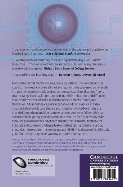 From optical fundamentals to advanced applications, this comprehensive guide to micro-optics covers all the key areas for those who need an in-depth introduction to micro-optic devices, technologies, and applications. Topics covered range from basic optics, optical materials, refraction, and diffraction, to micro-mirrors, micro-lenses, diffractive optics, optoelectronics, and fabrication. Advanced topics, such as tunable and nano-optics, are also discussed. Real-world case studies and numerous worked examples are provided throughout, making complex concepts easier to follow, whilst an extensive bibliography provides a valuable resource for further study. With exercises provided at the end of each chapter to aid and test understanding, this is an ideal textbook for graduate and advanced undergraduate students taking courses in optics, photonics, micro-optics, microsystems, and MEMs. It is also a useful self-study guide for research engineers working on optics development.