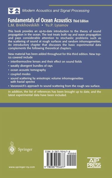 This book provides an up-to-date introduction to the theory of sound propagation in the ocean. The text treats both ray and wave propagation and pays considerable attention to stochastic problems such as the scattering of sound at rough surfaces and random inhomogeneities. An introductory chapter that discusses the basic experimental data complements the following theoretical chapters.