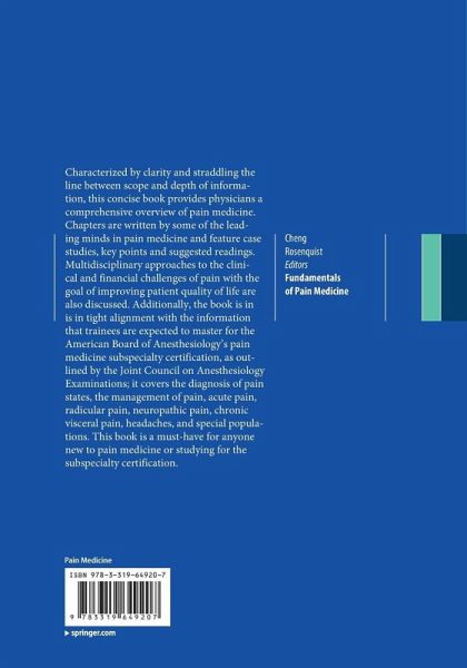 Characterized by clarity and straddling the line between scope and depth of information, this concise book provides physicians a comprehensive overview of pain medicine. Chapters are written by some of the leading minds in pain medicine and feature case studies, key points and suggested readings. Multidisciplinary approaches to the clinical and financial challenges of pain with the goal of improving patient quality of life are also discussed. Additionally, the book is in is in tight alignment with the information that trainees are expected to master for the American Board of Anesthesiology's pain medicine subspecialty certification, as outlined by the Joint Council on Anesthesiology Examinations; it covers the diagnosis of pain states, the management of pain, acute pain, radicular pain, neuropathic pain, chronic visceral pain, headaches, and special populations. This book is a must-have for anyone new to pain medicine or studying for the subspecialty certification.
