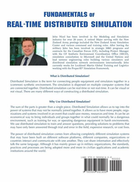 This is the book that the simulation industry is missing! This is an introduction and reference for Real-Time Distributed Simulation. Distributed Simulation is the term describing connecting people, equipment and simulators together in a synthetic environment. If you are involved with any type of simulator and want to connect it to another system, then you need to have this book. The book describes terrain in simulation, 3-D model structure, Simulator Qualification Levels, Distributed Interactive Simulation (DIS), High Level Architecture (HLA), Validation, Verification and Accreditation (VV&A) as well as providing a methodology and process for planning and implementing a Distributed Simulation project. The book also provides an invaluable Distributed Simulation Agreements Template. This is a very useful book for anyone involved with distributed simulation and was written by someone that has spent nearly 20 years in the industry: building simulators and connecting them to other simulators.
