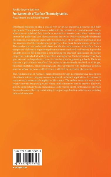 Interfacial phenomena play a crucial role in various industrial processes and daily operations. These phenomena are related to the formation of emulsions and foams, adsorption on solid and fluid interfaces, wettability alteration, and others that strongly impact the quality and cost of products and processes. Understanding the interfacial phenomena encompasses inexorably the description of surface thermodynamics and the assessment of thermodynamic properties. The book Fundamentals of Surface Thermodynamics introduces the basics of the thermodynamics of interface from a perspective of chemical engineering thermodynamics and surface chemistry. It provides insights into real-life phenomena, emphasizing the practical significance of abstract properties routinely dealt with by scientists and engineers. The book is tailored for both graduate and undergraduate courses in chemistry and engineering schools. The book content is particularly beneficial for industry professionals involved in oil & gas, fluid transportation, nanotechnology, and other operations with multiphase complex systems, where the process effectiveness is affected by interfacial phenomena.