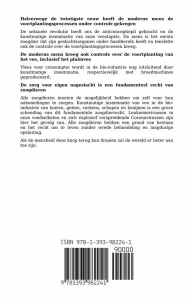 Halverwege de twintigste eeuw heeft de moderne mens de voortplantingsprocessen onder controle gekregen De seksuele revolutie heeft ons de anticonceptiepil gebracht en de kunstmatige inseminatie van onze veestapels. De mens is het eerste zoogdier dat zijn geslachtsorganen onder handbereik heeft en tenslotte ook de controle over de voortplantingsprocessen kreeg. De moderne mens kreeg ook controle over de voortplanting van het vee, inclusief het pluimvee Vlees voor consumptie wordt in de bio-industrie nog uitsluitend door kunstmatige inseminatie, respectievelijk met broedmachines geproduceerd. De zorg voor eigen nageslacht is een fundamenteel recht van zoogdieren Alle zoogdieren moeten de mogelijkheid hebben om zelf voor hun nakomelingen te zorgen. Kunstmatige inseminatie van vee in de bio-industrie van koeien, geiten, varkens, schapen en konijnen is een grove schending van dit fundamentele zoogdierrecht. Leukemievirussen in onze voedselketen en zich explosief verspreidende Coronavirussen zijn hier het gevolg van. Alle zoogdieren hebben een grond van bestaan en het recht om te leven zonder wrede behandeling en langdurige opsluiting. Als de mensheid deze knop terug kan draaien zal de wereld er beter aan toe zijn.