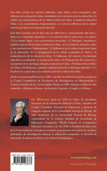 Este libro analiza los factores culturales, tanto chinos como extranjeros, que influyen en la educación china, centrándose en la relación entre la educación y la cultura, las características de la cultura tradicional china, la tradición educativa china y sus características fundamentales, así como la influencia de la cultura tradicional china en la educación del país. Este libro acumula más de diez años de reflexiones y conocimientos del autor y abarca los contenidos siguientes: (1) La relación entre la educación y la cultura. (2) La cultura china y sus características esenciales. (3) Tipología, naturaleza y espíritu esencial de la cultura tradicional china. (4) La tradición educativa china y sus características fundamentales. (5) Influencia de la cultura tradicional china en la educación. (6) La propagación de la cultura occidental en China y la modernización de la educación china. (7) Influencia del sistema y la ideología educativos occidentales en la educación china. (8) Propagación del marxismo y nacimiento de la ideología educativa marxista en China. (9) Educación soviética en China. (10) Reforma y apertura y pluralización de la ideología educativa. (11) Explorar el camino hacia la modernización de la educación china. Desde su primera publicación en 2004, este libro ha obtenido el primer premio en la Cuarta Competición de Excelencia de Investigación en Humanidades y Ciencias Sociales de las Universidades Chinas en 2006. Además, el libro ha sido traducido a diferentes idiomas, incluyendo el japonés, el inglés y el francés.
