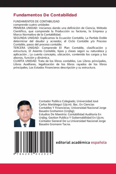 FUNDAMENTOS DE CONTABILIDADcomprende cuatro unidadesPRIMERA UNIDAD: Iniciamos dando una definición de Ciencia, Método Científico, que comprende la Producción su factores, la Empresa y Marco Normativo de la Contabilidad.SEGUNDA UNIDAD: Explicamos la Ecuación Contable, La Partida Doble determinar del deudor y acreedor, el Ciclo Contable y/o Proceso Contable, pasos del proceso contable.TERCERA UNIDAD: Comprende El Plan Contable, clasificación y estructura, El Asiento Contable, tipos y clases según su naturaleza y aplicación ; La cuenta concepto, ubicación, contenido los cargos y los abonos, función y dinámica. CUARTA UNIDAD: Trata de los libros contables, Los Libros principales, Libros Auxiliares, legalización de los libros rayados de los libros principales; Los Estados Financieros descripción y su estructura.