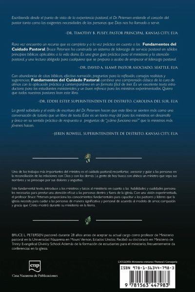Uno de los trabajos más importantes del ministro es el cuidado pastoral; reconfortar, asesorar y guiar a las personas en la reconciliación de las relaciones con Dios y con los demás. La gente de hoy busca con ahínco un ministro que sepa sus nombres y se preocupe por sus dolores y angustias. Este fundamental texto, introduce a los ministros y laicos al ministerio en cuanto a las habilidades y cualidades personales necesarias para prestar una atención eficaz a las personas dentro y fuera de la iglesia. Con una visión experimentada, el profesor Bruce Petersen proporciona los conocimientos fundamentales para capacitar a los pastores y líderes que la iglesia necesita para cuidar a las personas de manera significativa y personal de acuerdo al modelo de amor, compasión y gracia que Cristo mostró durante su ministerio en la tierra. BRUCE L. PETERSEN pastoreó durante 28 años antes de aceptar su actual cargo como profesor de Ministerio pastoral en la Universidad Nazarena en Mount Vernon, Estados Unidos. Recibió su doctorado en Ministerio de Trinity Evangelical Divinity School. Además de la formación de estudiantes para el ministerio, frecuentemente da conferencias en la iglesia.