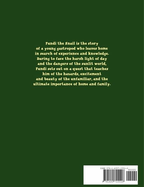 Fundi the Snail is the story of a young gastropod who leaves home in search of experience and knowledge. Daring to face the harsh light of day and the dangers of the sunlit world, Fundi sets out on a quest that teaches him of the hazards, excitement and beauty of the unfamiliar, and the ultimate importance of home and family. The vibrantly colored, charming illustrations add to the wonderful character of the story and help to create this heartfelt and timeless tale of curiosity, adventure and love.