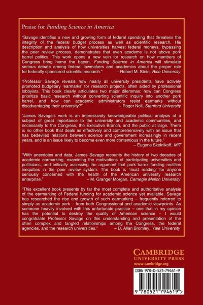 Since the 1950s, the federal government has relied on the peer review system for funding high quality academic science. Yet, despite the success of American science, peer review is under attack for being a biased 'good old boy' network that helps rich research universities get richer. As a remedy for these biases, university presidents and members of Congress have turned to the earmarking of science projects and facilities in the federal budget. This earmarking of funds, however, brings with it new areas of tension and suspicion. Funding Science in America, first published in 1999, is the first book to explore both the pros and the cons of the controversial academic earmarking issue. Savage analyzes the earmarking decision of both university presidents and members of Congress, identifies those universities that have benefited most from earmarking, as well as examining the question of whether earmarking improves their ability to compete for research.