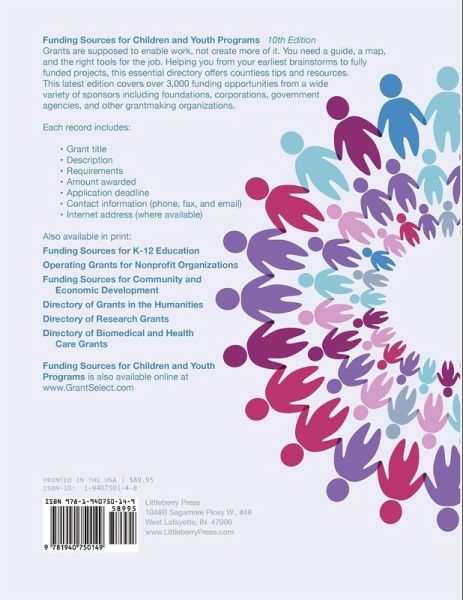 This one-stop source offers more than 1,600 current funding opportunities from a wide variety of sponsors including foundations, corporations, government agencies, and other organizations. Each entry includes grant title, description, requirements, amount, application deadline, contact information (phone, fax, and email), Internet access, sponsor name and address, and sample awarded grants. Grantseekers can easily find information about funding for thousands of programs to benefit young people such as youth violence prevention, children's healthcare and health research, teen pregnancy prevention, youth sports, and after-school programs. Three user-friendly indexes (Subject, Program Type, and Geographic Focus) help grantseekers quickly find the ideal funding opportunity. Each entry includes: ¿ Sponsor name and address ¿ Sponsor's area of interest ¿ Grant title ¿ Contact information ¿ Description and Requirements ¿ Sample awards (where applicable) ¿ Web address (if available) Funding Sources for Children and Youth Programs is also available online at www.GrantSelect.com Also available in print from the GRANTS Database Series: Funding Sources for Community and Economic Development Funding Sources for K-12 Education Operating Grants for Nonprofit Organizations Directory of Grants in the Humanities Directory of Grants for Arts and Cultural Programs Directory of Research Grants Directory of Biomedical and Health Care Grants