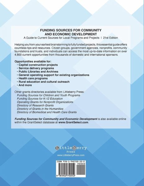 Taking you from concept to reality, Funding Sources for Community and Economic Development can guide you to funding sources for your community project or program. Urban, rural, and tribal organizations will find the most up-to-date information on over 4,800 current opportunities from hundreds of domestic and international sponsors. Funding may be used for: affordable housing economic revitalization healthy places anti-racism campaigns social/human services delivery workforce development community centers women/minority business development job creation local and regional food systems infrastructure disaster assistance rural communities and more Also available in the GRANTS Series: Funding Sources for Children and Youth Programs Funding Sources for K-12 Education Operating Grants for Nonprofit Organizations Funding Sources for Faith-Based Programs Directory of Research Grants Directory of Grants in the Humanities Directory of Biomedical and Health Care Grants Funding Sources for Community and Economic Development is also available online within the GrantSelect database at www.GrantSelect.com