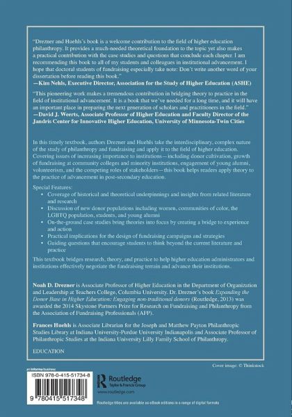 In this timely textbook, authors Drezner and Huehls take the interdisciplinary, complex nature of the study of philanthropy and fundraising and apply it to the field of higher education. Covering issues of increasing importance to institutions-including donor cultivation, growth of fundraising at community colleges and minority institutions, engagement of young alumni, volunteerism, and the competing roles of stakeholders-this book helps readers apply theory to the practice of advancement in post-secondary education. Special Features: Coverage of historical and theoretical underpinnings and insights from related literature and research. Discussion of new donor populations including women, communities of color, the LGBTQ population, students, and young alumni. On-the-ground case studies bring theories into focus by creating a bridge to experience and action. Practical implications for the design of fundraising campaigns and strategies. Guiding questions that encourage students to think beyond the current literature and practice. This textbook bridges research, theory, and practice to help higher education administrators and institutions effectively negotiate the fundraising terrain and advance their institution.