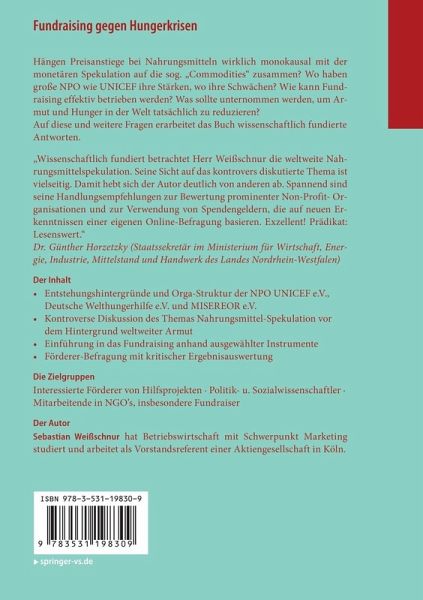 "Wissenschaftlich fundiert betrachtet Herr Weißschnur die weltweite Nahrungsmittelspekulation. Seine Sicht auf das kontrovers diskutierte Thema ist vielseitig. Damit hebt sich der Autor deutlich von anderen ab. Spannend sind seine Handlungsempfehlungen zur Bewertung prominenter Non-Profit-Organisationen und zur Verwendung von Spendengeldern, die auf neuen Erkenntnissen einer eigenen Online-Befragung basieren. Exzellent! Prädikat: Lesenswert."