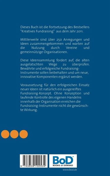 Dieses Buch ist die Fortsetzung des Bestsellers "Kreatives Fundraising" aus dem Jahr 2011.Mittlerweile sind über 250 Ideen und Anregungen zusammengekommen und warten auf die Nutzung durch Vereine und gemeinnützige Organisationen.Diese Ideensammlung fordert auf, die alten ausgelatschten Wege zu überprüfen. Bewährte, erfolgreiche Fundraising-Instrumente sollen beibehalten und um neue, innovative Komponenten ergänzt werden.Voraussetzung für den erfolgreichen Einsatz neuer Ideen ist natürlich ein ausgereiftes Fundraising-Konzept. Ohne Konzeption und laufende Kontrolle des eigenen Handelns innerhalb der Organisation erreichen die Fundraising-Instrumente nicht die gewünschte Wirkung.