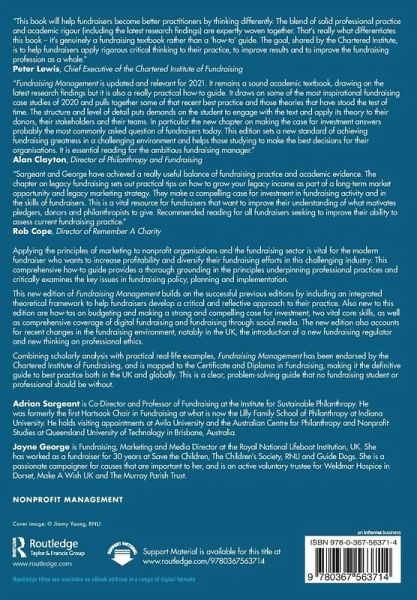 "Fundraising Management is updated and relevant for 2021. It remains a sound academic textbook, drawing on the latest research findings but it is also a really practical how-to guide. It draws on some of the most inspirational fundraising case studies of 2020 and pulls together some of that recent best practice and those theories that have stood the test of time. The structure and level of detail puts demands on the student to engage with the text and apply its theory to their donors, their stakeholders and their teams. In particular the new chapter on making the case for investment answers probably the most commonly asked question of fundraisers today. This edition sets a new standard of achieving fundraising greatness in a challenging environment and helps those studying to make the best decisions for their organisations. It is essential reading for the ambitious fundraising manager."