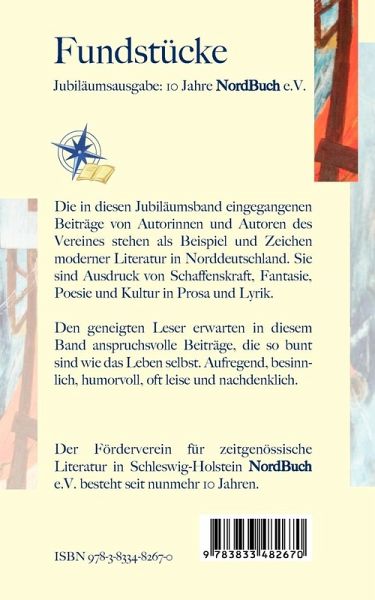 Leser und Leserin erwarten in dem Jubiläumsband Fundstücke im Rahmen des 10.-jährigen Bestehens des Fördervereins für zeitgenössische Literatur NordBuch e.V. ausgewählte Beiträge in Lyrik und Prosa. Familien-, Liebes-, Tiergeschichten-, Märchen und Gedichte, bunt wie das Leben selbst. Aufregend, humorvoll, spannend und besinnlich leise wird fiktiv, erlebnisreich und ergreifend in hochdeutsch als auch in einzelnen Passagen niederdeutsch erzählt. Ein Beispiel und Zeichen moderner Literatur mit Ausdruck von Schaffenskraft, Fantasie, Poesie und Kultur. Zudem berichten heutige Autoren Interessantes und Wissenswertes in anspruchsvoller Kurzform über Dichter und Denker wie Heine, Lessing, Georg Philipp Schmidt zu Lübeck, Bertolt Brecht und Joseph von Eichendorff zu deren Jubiläumsjahren. Eine besondere Lektüre, nicht nur zur Urlaubszeit.