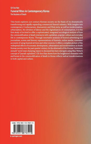 This book explores 21st century Korean society on the basis of its dramatically transforming and rapidly expanding commercial funeral industry. With insights into contemporary Confucianism, shamanism and filial piety, as well as modernisation, urbanisation, the division of labour and the digitalisation of consumption, it is the first study of its kind to offer a sophisticated, integrated sociological analysis of how the commodification of death intersects with capitalism, popular culture and everyday life in contemporary Korea. Through innovative analyses of funeral advertising and journalism, screen and literary representations of funerals, online media, consumer accounts of using funeral services and other sources, it offers a complex picture of the widespread effects of economic development, urbanisation and modernisation in South Korean society over the past quarter century. In the aftermath of the Korean "economic miracle" novel ways of paying respect to deceased kin have emerged; using Max Weber's concept of "pariah capitalism", Gil-Soo Han shows how the heightened obsession with and boom in the commodification of death in Korea reflects radical transformations in both capital and culture.