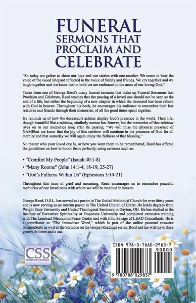 "So today we gather to share our love and our stories with one another. We come to hear the voice of the Good Shepard reflected in the voice of family and friends. We cry together and we laugh together and we know that in both we are embraced in the arms of our loving God." Taken from one of George Reed's many funeral sermons that make up Funeral Seermons that Proclaim and Celebrate, Reed teaches that the passing of a loved one should not be seen as the end of a life, but rather the beginning of a new chapter in which the deceased has been reborn with God in heaven. Throughout his book, he encourages his audience to remember their late relatives and friends through their memories, of all the good times spent together. He reminds us of how the deceased's actions display God's presence in the world. Their life, though beautiful like a rainbow, similarly cannot last forever, but the memories of that rainbow lives on in our memories long after its passing. "We will miss the physical presence of NAME but we know that the joy of this rainbow will continue in the presence of God for all eternity and that someday we will again enjoy the fullness of that blessing." No matter who your loved one is, or how you want them to be remembered, Reed has offered the guidelines on how to honor them perfectly, using sermons such as: • "Comfort My People" (Isiah 40:1-8) • "Many Rooms" (John 14:1-4, 18-19, 25-27) • "God's Fullness Within Us" (Ephesians 3:14-21) Throughout this time of grief and mourning, Reed encourages us to remember peaceful memories of our loved ones with whom we will be reunited in heaven.