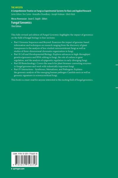 Part I: Genome sequences and beyond.- Chapter 1: Starship discovery:a collaborative approach to uncover massive transposable elements.- Chapter 2: The three-dimensional chromatin architecture in fungi.- Chapter 3: Fungi from extreme environments-genome sequences and beyond.- Part II: Cell and developmental biology.- Chapter 4: Recent advances in high-throughput genetics in fungi.- Chapter 5: Genome-wide A-to-I RNA editing during sexual reproduction in filamentous ascomycetes.- Chapter 6: A symphony of roles for codon usage in fungal genomics.- Chapter 7: Epigenetic regulation in early-diverging fungi.- Part III: Biotechnology.- Chapter 8: Fungal diversity related to plant biomass degradation.- Chapter 9: Genomes and genomics of the genus Trichoderma.- Part IV: Interactions-Symbioses, Mutualisms, and Pathogens.- Chapter 10: Genomic innovation and virulence evolution in the emerging human fungal pathogen Candida auris.- Chapter 11: General trends of genomic signatures of the ectomycorrhizal symbiosis in fungi:a comparison across multiple lineages.
