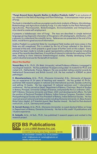 "Fungi around some aquatic bodies in Andhra Pradesh, India" is an outcome of our research in the field of Mycology and Plant Pathology. It encompasses major groups of fungi. The book is intended to enthuse youngsters particularly students of Botany, Microbiology, Biotechnology and Agriculture studying Fungi. It is also helpful to the Plant Pathologists, Agriculturists, Pharmaceutists, Biotechnologists, Environmentalists and Entrepreneurs who intend to create self-employment. It presents a kaledoscopic view of Fungi. The taxa are described in simple technical language giving diagnostic characters of the genera with photographs, distribution, with a glossary to understand the scientific terms. References are presented at the end of the book, would form a good source of information. Andhra Pradesh is a potential State for mycological field studies and many areas in the State are still unexplored. This is evident by the list of fungi collected in the districts, enclosed at the end, which presents a good scope of further work on this subject. Every attempt has been made to include a good representative collection of species including some of the recently described taxa. It would be of interest to indicate the usefulness of this data, leading to more intensive biotechnological studies, thereby developing further useful industrial avenues for the benefit of mankind.