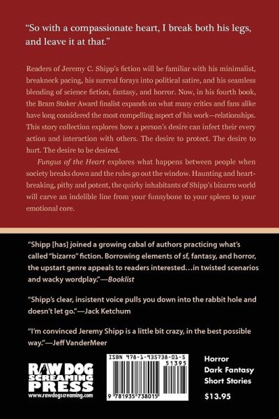 Readers of Jeremy C. Shipp's fiction will be familiar with his minimalist, breakneck pacing, his surreal forays into political satire, and his seamless blending of science fiction, fantasy, and horror. Now, in his fourth book, the Bram Stoker Award finalist expands on what many critics and fans alike have long considered the most compelling aspect of his work-relationships. This story collection explores how a person's desire can infect their every action and interaction with others. The desire to protect. The desire to hurt. The desire to be desired. Fungus of the Heart explores what happens between people when society breaks down and the rules go out the window. Haunting and heartbreaking, pithy and potent, the quirky inhabitants of Shipp's bizarro world will carve an indelible line from your funnybone to your spleen to your emotional core.
