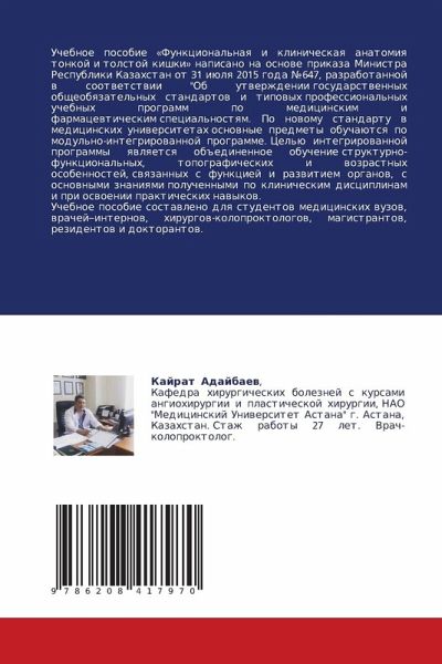 Uchebnoe posobie 'Funkcional'naq i klinicheskaq anatomiq tonkoj i tolstoj kishki' napisano na osnowe prikaza Ministra Respubliki Kazahstan ot 31 iülq 2015 goda ¿647, razrabotannoj w sootwetstwii "Ob utwerzhdenii gosudarstwennyh obscheobqzatel'nyh standartow i tipowyh professional'nyh uchebnyh programm po medicinskim i farmacewticheskim special'nostqm. Po nowomu standartu w medicinskih uniwersitetah osnownye predmety obuchaütsq po modul'no-integrirowannoj programme. Cel'ü integrirowannoj programmy qwlqetsq ob#edinennoe obuchenie strukturno-funkcional'nyh, topograficheskih i wozrastnyh osobennostej, swqzannyh s funkciej i razwitiem organow, s osnownymi znaniqmi poluchennymi po klinicheskim disciplinam i pri oswoenii prakticheskih nawykow.Uchebnoe posobie sostawleno dlq studentow medicinskih wuzow, wrachej-internow, hirurgow-koloproktologow, magistrantow, rezidentow i doktorantow.