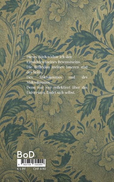 Dieses Buch widme ich den Einsichten meines Bewusstseins.Die Reflexion meines Inneren und des Seins.Des Mikrokosmos und des Makrokosmos...Denn nur wer reflektiert über das Universum, findet sich selbst.