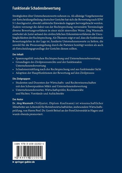 Streitigkeiten über Unternehmenswerte nehmen zu. Als alleinige Vorgehensweise zur Entscheidungsfindung deutscher Gerichte hat sich die Bewertung nach IDW S 1 durchgesetzt, obwohl zahlreiche Einwände dagegen hervorgebracht werden. Zudem vermengt die dabei von der Rechtsprechung verwendete Terminologie diverse Bewertungsverfahren in einer nicht sinnvollen Weise. Jörg Wasmuth erarbeitet als Jurist anhand des zivilrechtlichen Erkenntnisverfahrens die Unzulänglichkeiten der Rechtsprechung. Als Ökonom zeigt er auf, dass die funktionale Bewertungslehre in der Lage ist, fundierte Unternehmenswerte zu liefern, die sowohl für die Prozesseingehung durch die Parteien benötigt werden als auch als Entscheidungsgrundlage der Gerichte dienen sollten.