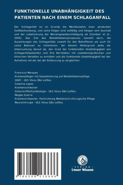Der Schlaganfall ist im Grunde die Manifestation einer zerebralen Gefäßerkrankung, und seine Folgen sind vielfältig und hängen vom Ausmaß und der Lokalisierung der Nervengewebeschädigung ab (Cambier et al., 2005). Das Ziel des Rehabilitationsprozesses besteht darin, die Auswirkungen des Schlaganfalls sowohl für den Betroffenen als auch für seine Betreuer zu minimieren. Vor diesem Hintergrund zielte die Untersuchung darauf ab, den Grad der funktionellen Unabhängigkeit von Schlaganfallpatienten und ihre Korrelation mit soziodemografischen und klinischen Variablen zu ermitteln und die funktionelle Unabhängigkeit bei der Aufnahme mit der bei der Entlassung zu vergleichen.