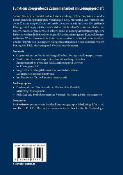 Sabine Gerster betrachtet anhand einer umfangreichen Empirie die an der Lösungserstellung beteiligten Abteilungen F&E, Marketing und Vertrieb und deren Zusammenspiel. Dabei beschreibt die Autorin, wie funktionsübergreifende Lösungserstellungsprojekte und die dahinterstehenden Prozesse innerhalb eines Unternehmens organisiert sein sollten, damit es Lösungsanbietern gelingt, eine Balance zwischen Individualisierung und Standardisierung ihrer Kundenlösungen zu finden. Weiterhin nennt die Autorin praxisorientierte Koordinationsansätze, um die Floprate von Lösungserstellungsprojekten durch einen komplementären Beitrag von F&E, Marketing und Vertrieb zu reduzieren.