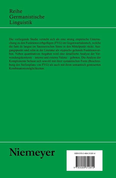 Die Studie versteht sich als eine streng empirische Untersuchung zu den Funktionsverbgefügen (FVG) im Gegenwartsdeutsch, welche die faits de langue im Saussureschen Sinne in den Mittelpunkt rückt. Ausgangspunkt sind zehn in der Literatur als "typisch" geltende Funktionsverben. Neben quantitativen Angaben wird eine detaillierte Analyse der Verwendungskontexte - interne und externe Valenz - geboten. Die Analyse der Komplemente befasst sich sowohl mit ihrer syntaktischen Form (Beschreibung des Stellenplans von FVG) als auch mit ihren semantisch gesteuerten Kombinationsmöglichkeiten.